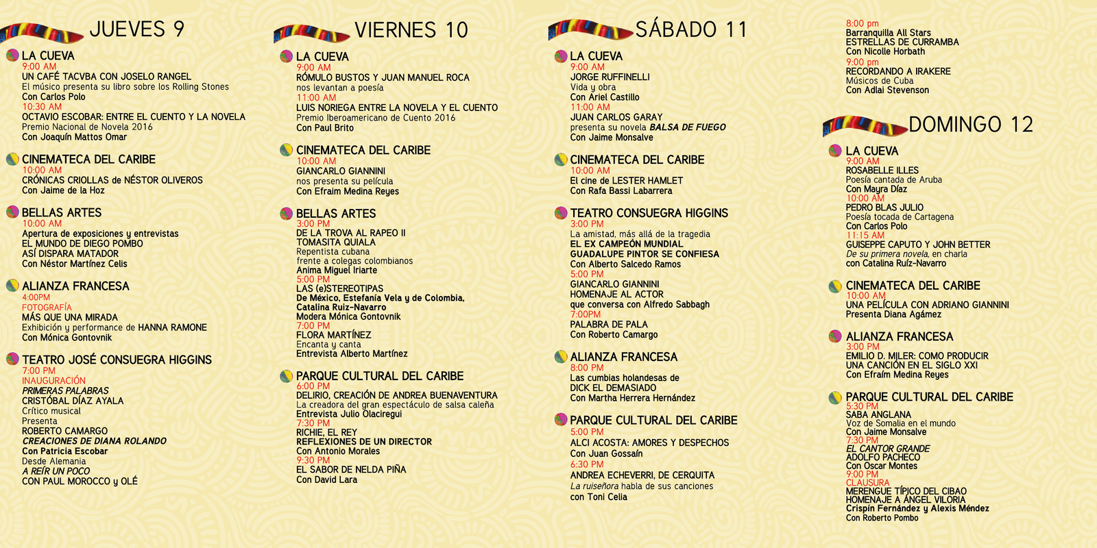 Para acceder gratuitamente, los asistentes deben asistir disfrazados. La música, la literatura, la poesía, el humor, el cine, el teatro y muchos espectáculos se darán cita cuando se abra el telón, el 9 de febrero, en el Teatro José Consuegra Higgins con la presentación del stand up comedy del estadounidense Rorocco y su grupo Olé. Culminará el 12 con un homenaje al compositor de La Hamaca grande, Adolfo Pacheco y a la cantadora de Gamero Nelda Piña.
