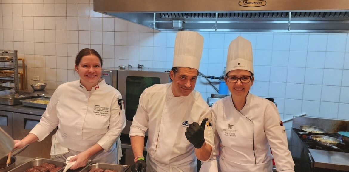 Frente a los fogones, los chefs canadienses Alexandrine Grégoire-Guindon y Samuel Sirois, junto a la chef ejecutiva de JW Marriott Bogotá, Yeni Chacón, durante la Semana de la Gastronomía Quebequense en Bogotá. (Crédito de la foto: JW Marriott Bogotá).